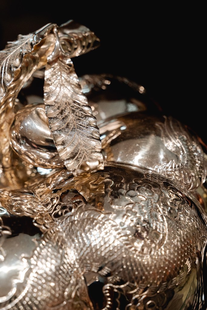 另外,惠記過去為不少大型賽事打造銀盃和獎品。開埠後,西人掀起各種娛樂活動和競技項目的風潮,一直以來有許多大小賽事在港舉行,最為人熟知的莫過於賽馬和打高球,惠記以往就常為香港賽馬會和香港高爾夫球會等機構打造銀盃和獎品。為尋覓惠記昔日出品,筆者早前到位於跑馬地的賽馬博物館碰碰運氣,果真找到一個印有「Wai Kee STERLING SILVER MADE IN HONG KONG」字眼的銀盃。該獎盃為1961年打吡大賽的獎盃,以一匹靜態的馬為造型,馬匹的眼睛、肌肉以及被毛尤能反映銀匠手工之精細,木製基座的正面釘有一塊銀片,刻上「THE HONG KONG DERBY/ WIN BY WAYFOONG’S WALBROOK/ RIDDEN BY R. TSAI/ TRAINED BY N METREVELLI/ 6-5-1961」字眼,由傳奇騎師蔡克文的家屬捐贈。筆者亦在網上找到多件惠記為比賽打造的銀器,包括為1954年香港賽馬會首屆董事盃和1962年香港高爾夫球會Audrey Browett Cup打造的純銀獎盃。往日,馬會和贊助商會聘請本港和英國等地的工匠打造純銀獎盃,可惜踏入廿一世紀,技藝超群的銀匠屈指可數,即使找到合適的銀匠亦所費高昂,故馬會十多年前已由專人從世界各地搜羅形態優美而價錢合理的古董獎盃。