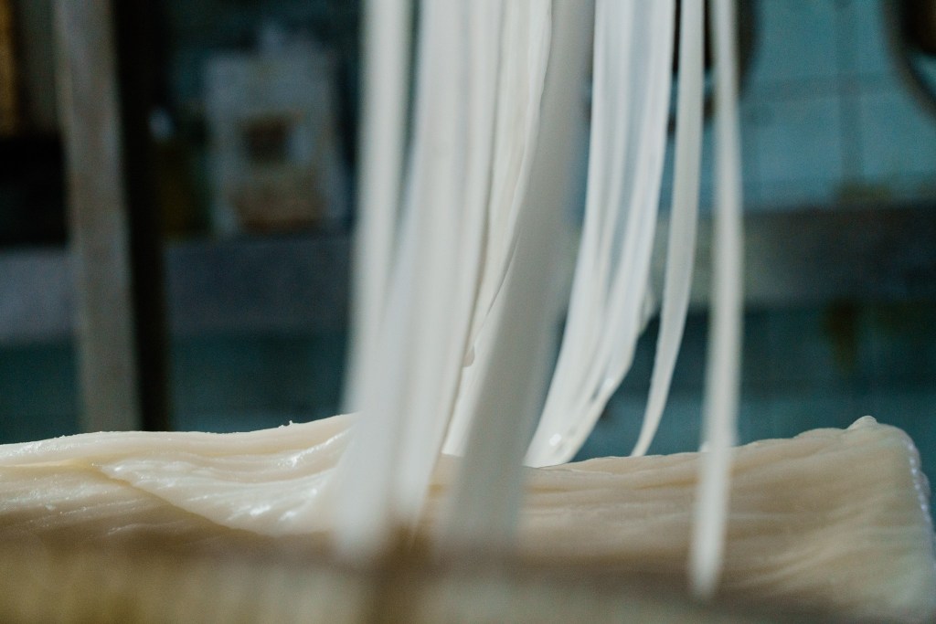 初踏進舖裏,乾麵放在左邊,即日生產的新鮮粉麵放在右邊,單從目錄就可以 看見多元化的款式,超過三十種麵款供客人選擇。不同款式的新鮮粉麵和乾 麵,例如蝦子麵、瑤柱麵、菠菜麵,雖然皆是麵類,外行人或許認為製作過程萬變不離其宗,其實林林總總的粉麵背後,是創辦人和接班人馬先生針對每種粉麵的特性所分析並雕琢而成的配方,以滿足五花八門的需求。以雲吞麵與河粉為例,兩者已是完全不同,製作材料和要求自然不同。雲吞麵著重爽滑彈 牙,因此選用鴨蛋和雞蛋作為材料,至於河粉追求圓潤滑溜,浸米時間務須準確拿捏,過於透徹會令河粉容易碎斷,不夠透徹就會過於硬身。由於每種麵種 的筋度和韌性不同,選用的麵粉也是截然不同,往往要用上十多種麵粉混合配 搭來製造不同質感的麵條。另外,每種粉麵亦會在製麵時加入高湯,因此它們各自擁有為其專門研究的獨特湯底,以蝦子麵為例,它的湯底是用大地魚、蝦子、蝦頭熬成,與麵一起共用,或先吃麵然後喝湯都同樣鮮甜。雖然麵餅外表平平無奇,盛載著的卻早已超越一碗麵。