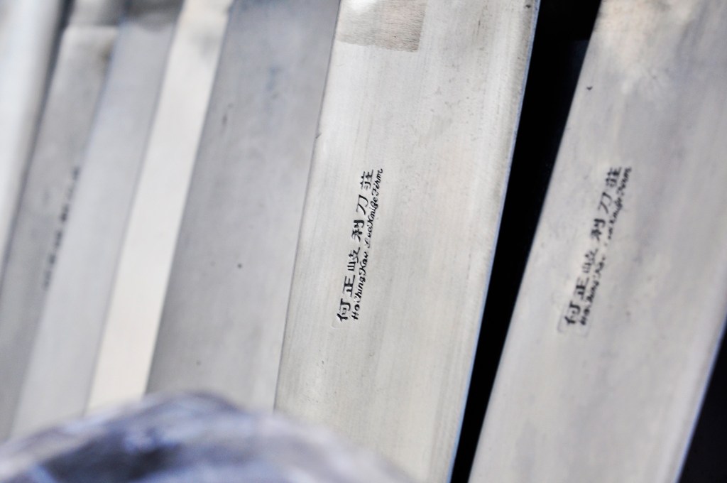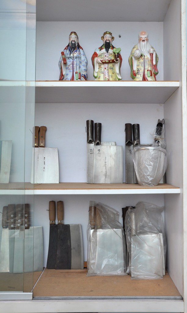 現址地點不在大街,街客自然不會太多。打開趟門走入舖內,察覺裝潢非常簡樸,不過間隔四正俐落。前舖用作銷售營運,左面玻璃櫃存放多把刀具,右面寫字枱用作處理文書。後舖存放許多闊身紙盒,層層疊疊高至成人胸膛,盒內鐵鑊全是批發出口,產地並非本港而是大陸,畢竟刀莊停辦工場多年。香港土地寸金尺土,維持工場運作代價不菲;加上行業已經式微,後生無意成為刀匠學徒,放棄製作也是無可奈何。既然港產刀具所剩無多,欲購從速,以免向隅。