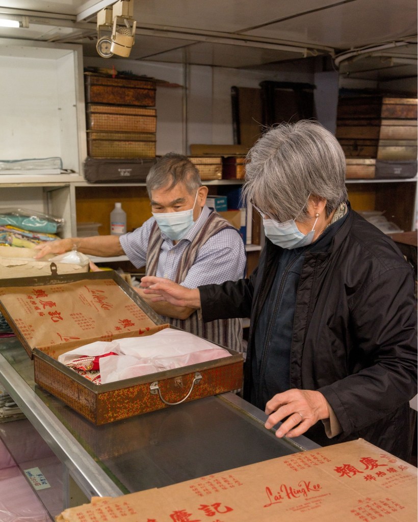 賴慶記於1964年在筲箕灣成立,主力售賣手造裙褂和龍鳳被。既為嫁妝、帶祝福之意,造工必不輕率。 賴慶記所售的傳統裙褂,由上海師傅採蘇繡技法,以蠶吐線作布料,再交本港裁縫用上手工銀線,釘製珍珠銀片,繡上龍鳳、鳥雀圖案,取其喜慶之感。 更上一層的工藝是能做到雙面繡的效果,即是在同一塊底料上、在同一繡制過程中,繡出正反兩面圖像一致的刺繡工藝。 布面布底皆圖案清晰。工藝水準如此的手製裙褂,一套僅售港幣3000元。「(其他傳統裙褂店)租一次都係依個價錢」老闆娘言。結業以前,賴慶記店內裙褂,連同特意為貯存而製的鐵盒,皆賣給各路識貨之人。 訪問當天有幸一睹鐵盒內的裙褂本體,多年以來完好如初: 珠點閃亮、銀線相映,線步鮮有斷露。用上印有自家牌名的牛油紙,妥善包覆好。來日成為私藏,相見未知何時。