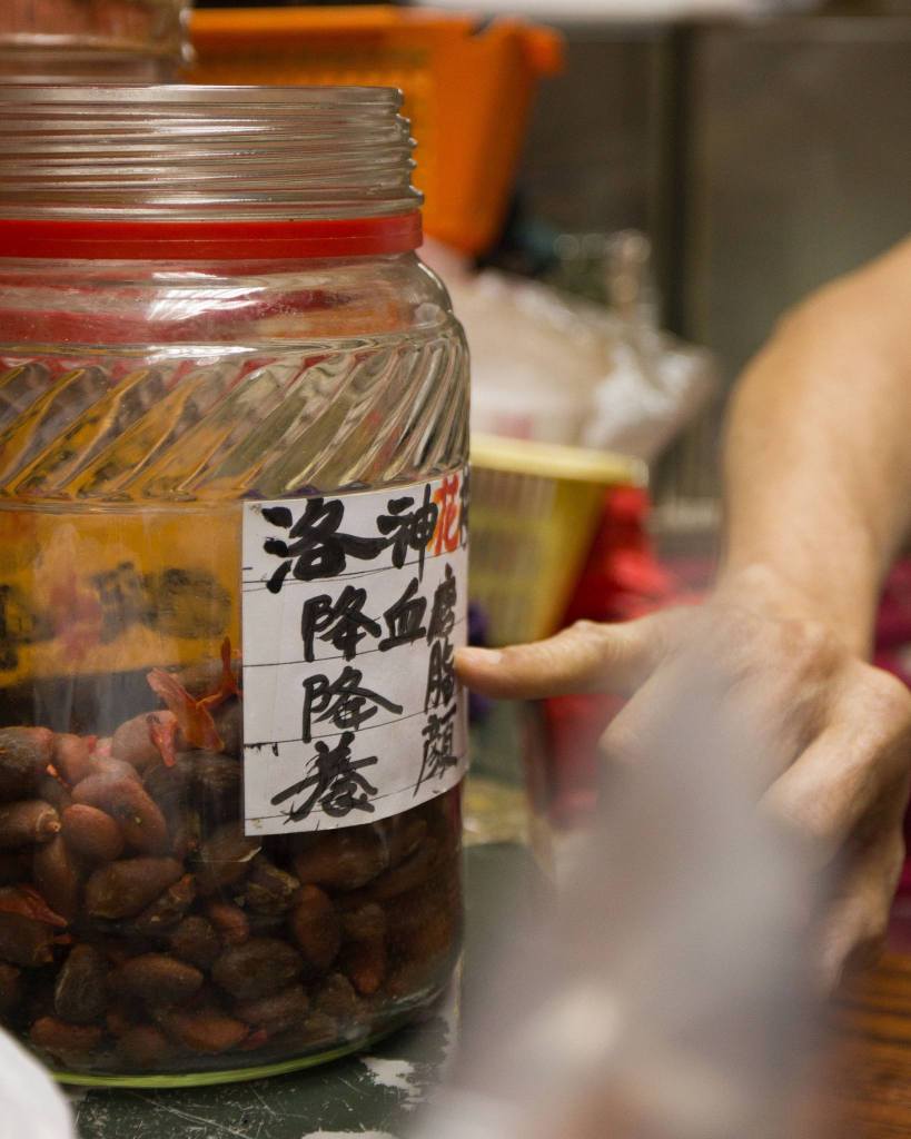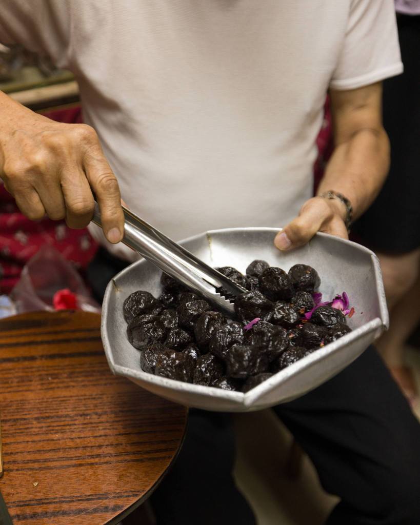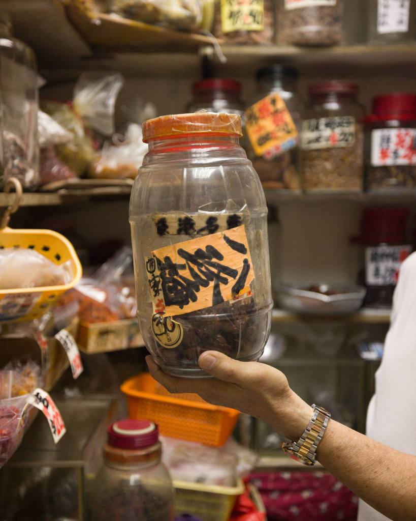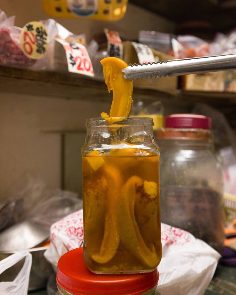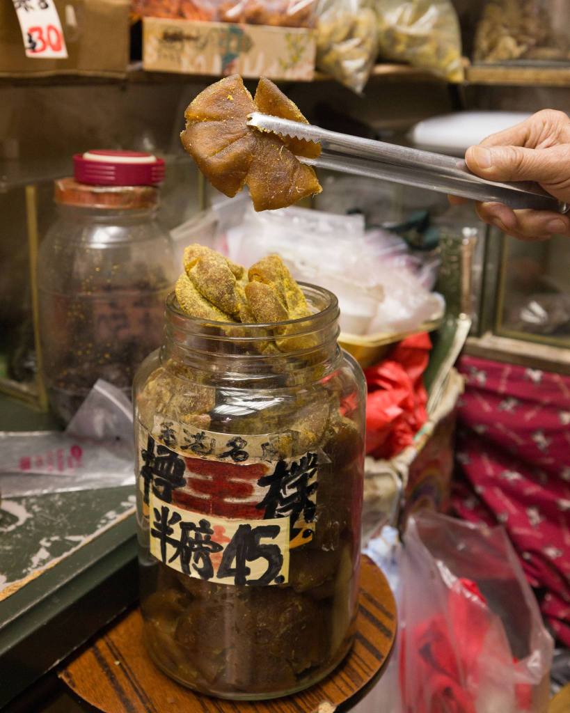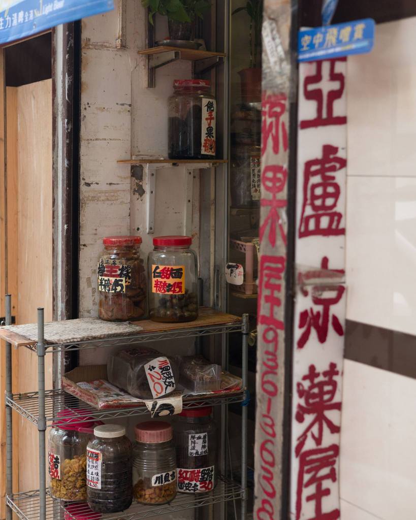 除了經典款式以外,有不少涼果均由阿盧後期研發的,以配合時代的口味和需求,例如水蜜桃乾、洛神花梅、桂花梅和蕃茄仔乾等。它們味道清新,適合解饞的同時,當然亦不乏藥用價值。以洛神花梅為例,它酸甜爽口,兼具降血壓和消脂養顏的功用。蕃茄仔乾是用番茄仔製成,帶有酸甜味,健胃之餘更可促進血液循環。至於昔日產品今日製作數量反而十分有限,需求今不如昔,阿盧也會視乎心情才拿出來售賣。現在有時候還會製作濕芒,酸酸甜甜的,通常客人欲購則要提早要求,他才會預先浸好。因為新鮮的疏果適合新鮮製作,加上大眾口味未必會一如以前,所以少量製作配合低調供應,實屬人之常情,否則只會浪費食材和醃製的時間和心思。