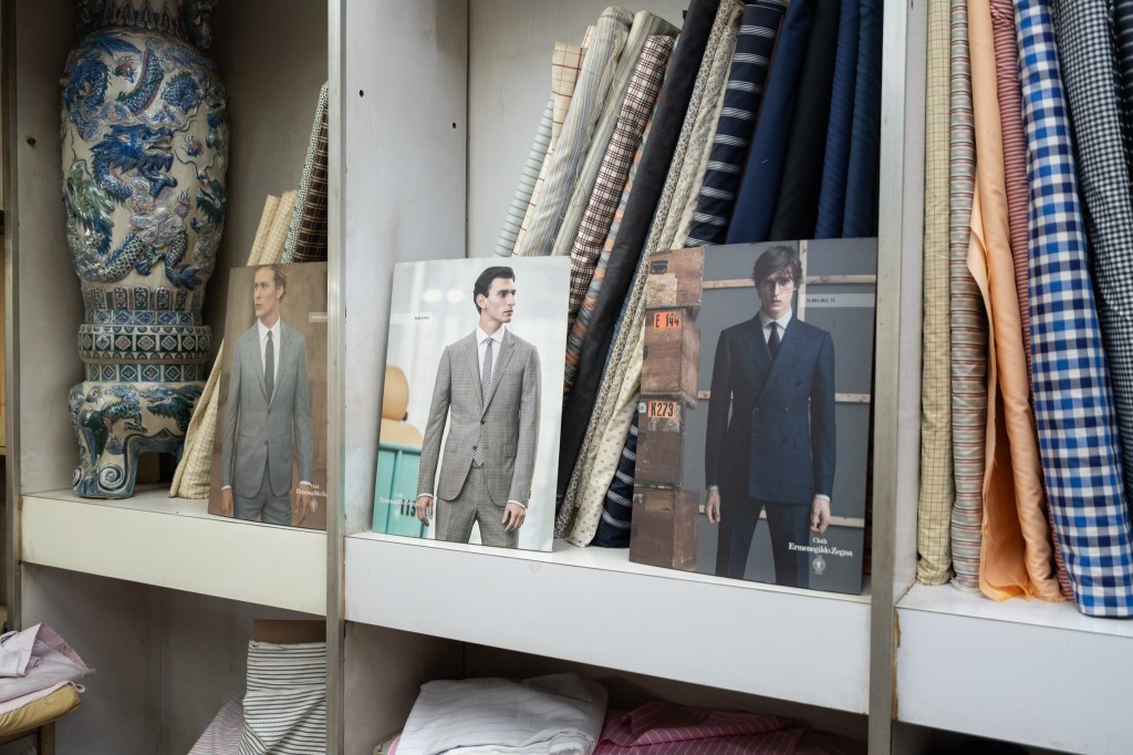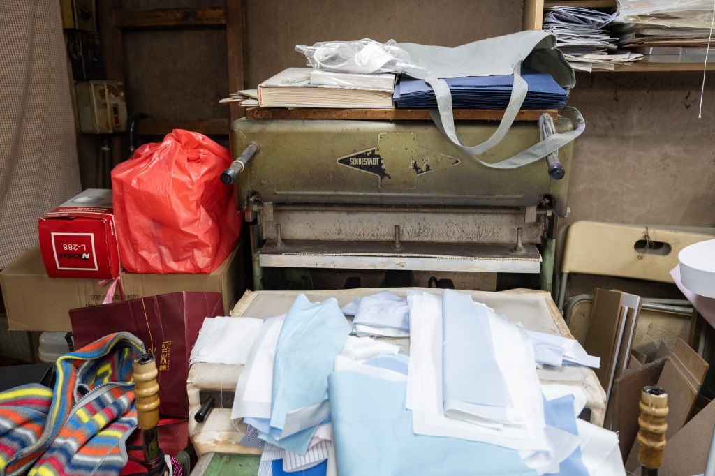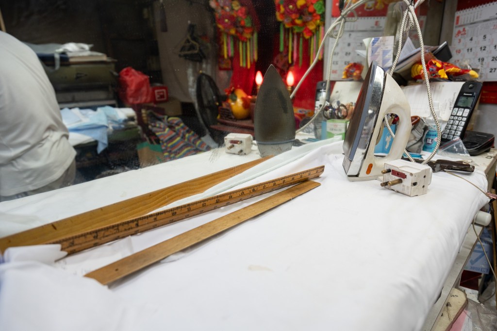 不止油壓機,熨的布樸同樣來自德國,德國布樸好處是縮水程度少,因此多年沿用至今,即使廠商因疫情搬遷而導致成本大增,他仍堅持選用,「我係唔會轉架,用左幾廿年,深信用依隻布樸最對得住客人同品質」;堅持用德國布樸外,車線則用上英國尼龍線,毋用擔心縮水導致出現波浪狀的不平整情況。用料上乘還需配備精細手工,就以針的縫紉密度為例,一寸必須用上十六針至十八針,這樣的密度恰到好處,製作出來的衣領才能「又薄又貼」。領口方面,師傅依照上海手工擦漿糊的方式封領,工序繁複但領口維持纖薄幼細,同時插骨(又稱領骨、領撐)亦堅持不用現成貨品,選用訂製插骨比坊間所用的厚一倍,即使燙風太用力也不會變彎。
