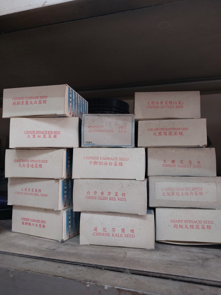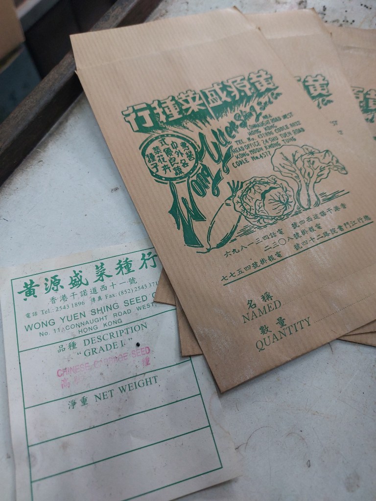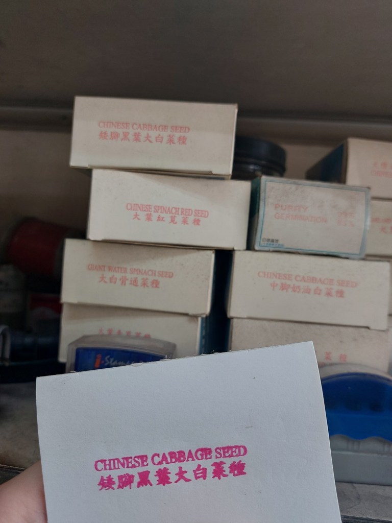 要越洋出口菜種,包裝馬虎不得。批發商送來菜種以後,員工需要篩走雜質,然後露天曬乾種子。其後,種子由兩層密封的包裝載住,以免在漫長的海運過程中破損、受潮而變壞。爲協助清關,菜種行會在兩層包裝間夾入一張卡片,寫有店鋪的聯絡方式,以及袋裏的種子種類。黃老闆指,當年批發生意忙不開交,所以訂製了幾個印章協助流程;圖中顯示的遲花芥蘭種(Chinese Kale Seed)和交配華冠上海白菜種(F-1 Chinese Cabbage Seed, Shanghai),就是當年其中兩款深受外國顧客歡迎的菜種。