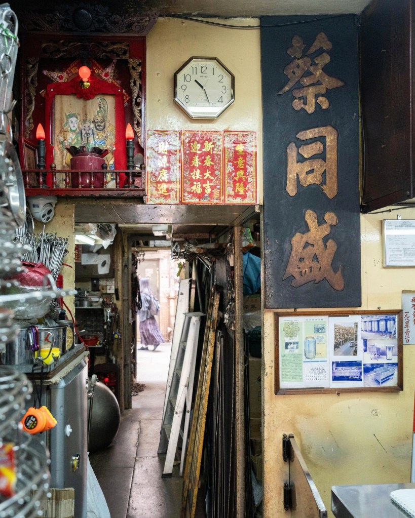 現今新填地街一帶不乏廚具及餐廳用品銷售店,今日的蔡同盛舖面霎眼與其他廚具店無異,但其內核隱身在一大堆不鏽鋼用具之中,客人要通過店內窄小的空間道,才窺探到店舖末端的小巷。梁生指這是不得之以的決定,「爐具工具太多,只能暫時放置在店內不阻礙行人及路面交通的位置」。多年前蔡同盛亦將製作爐蓋的程序轉到新界及內地的工場,原因是由於一個爐蓋需要人手揼上四、五百鎚,轉移場地能盡量減少對附近居民所造成的影響。委身油麻地民商混作的區域,蔡同盛適時順應以取得和諧融合。有趣的是店內放置一個三十吋的燒爐,不為銷售,而是像產品目錄般,爐身寫滿蔡同盛各種出品,如太空爐、碌豬爐、鴨爐等的大小直徑和價錢,一目了然。爐體置中位置更釘有一塊手掌大小、青銅製成的蔡同盛招牌,模效第一代老闆特意向本地鑄造廠訂做的樣式,寫上電話及店舖地址,附在手揼爐具上,精緻美觀,送到顧客手上亦收宣傳之效。