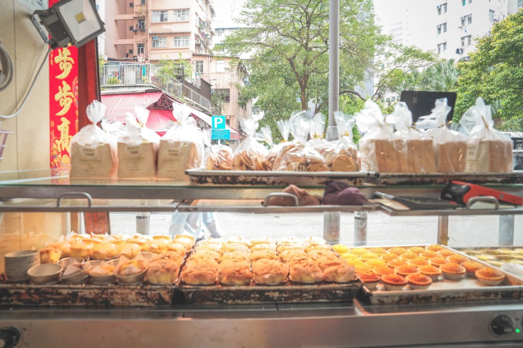 新香既是冰廳,也是餅店。舖頭門外有兩座大型麵包櫃,陳列逾30款新鮮麵包(註一)和中西榚點(註二),當中除了有貨如輪轉的曲奇皮蛋撻,更有稀有的自制白麵包出售,以自家出品確保用料和品質,方包又會被加工成為店內西多士、三文治等餐點 。訪問當天更有「即日限定」的忌廉筒、檸檬酥、牛油蛋糕,這數款限定榚點,部分是餅房師傅興之所致而製,最後那款則是他為家人所製而多造。