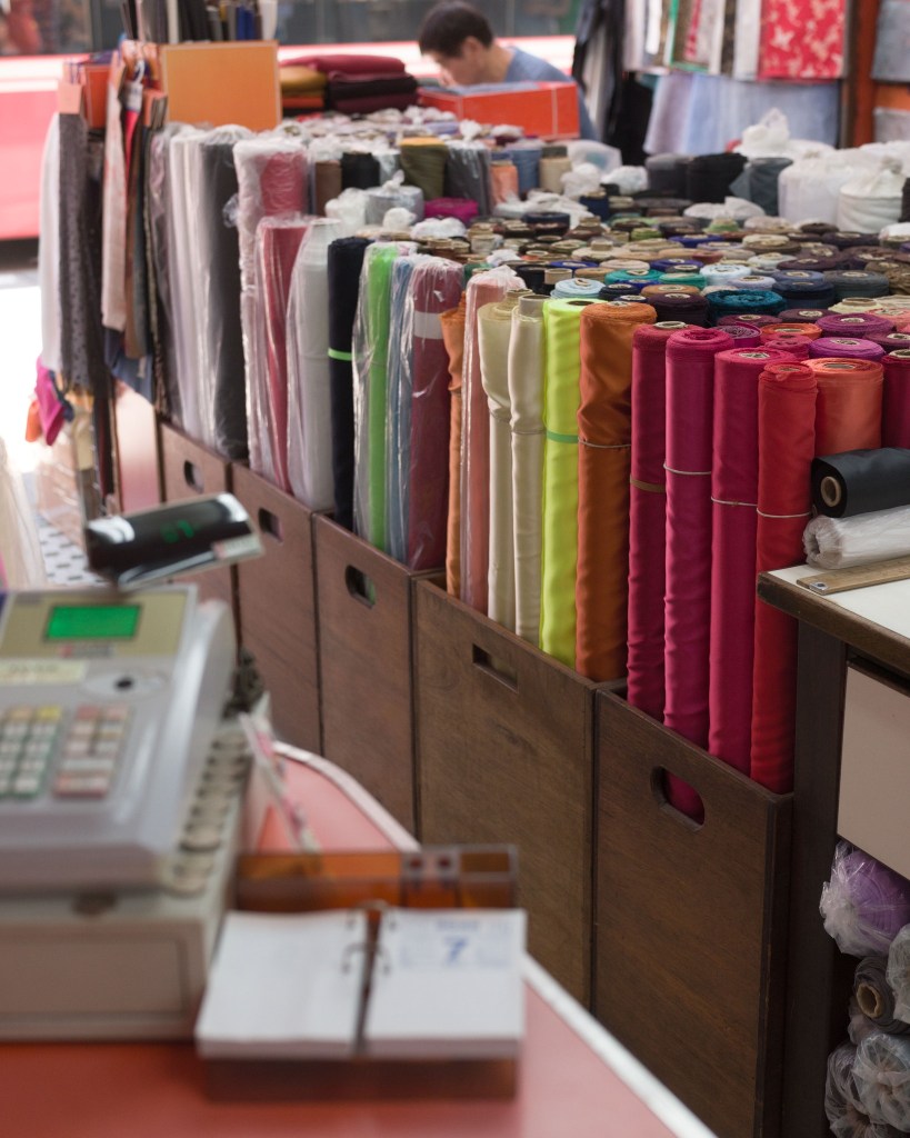 店內的陳設佈局五十多年來未曾有過大改動。店堂中央,一卷卷布疋豎立在木箱中,也有部分橫放於櫃底。左手邊亦掛滿各式布料,它們色彩紛呈、質感各異,無論是純色或花紋,皆一應俱全。右手邊則是店舖日常運作的核心,有收銀台、員工的工作檯面,以及整齊排列的布料色卡。