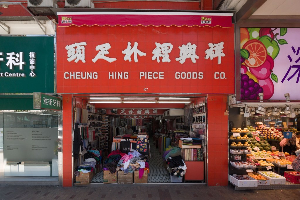 在深水埗南昌街街頭,「祥興裡朴疋頭」的橙底白字招牌格外引人注目。當視線由店外向內延伸,便會發現其設計獨具匠心。不僅店門外高懸橙色招牌,店內及深處的橫樑也鑲嵌了風格統一的「祥興裡朴疋頭」書法字樣。第二重、第三重、第四重招牌巧妙地融入店內空間,形成了層層遞進的透視效果,賦予了這間老舖別具一格的空間感。
