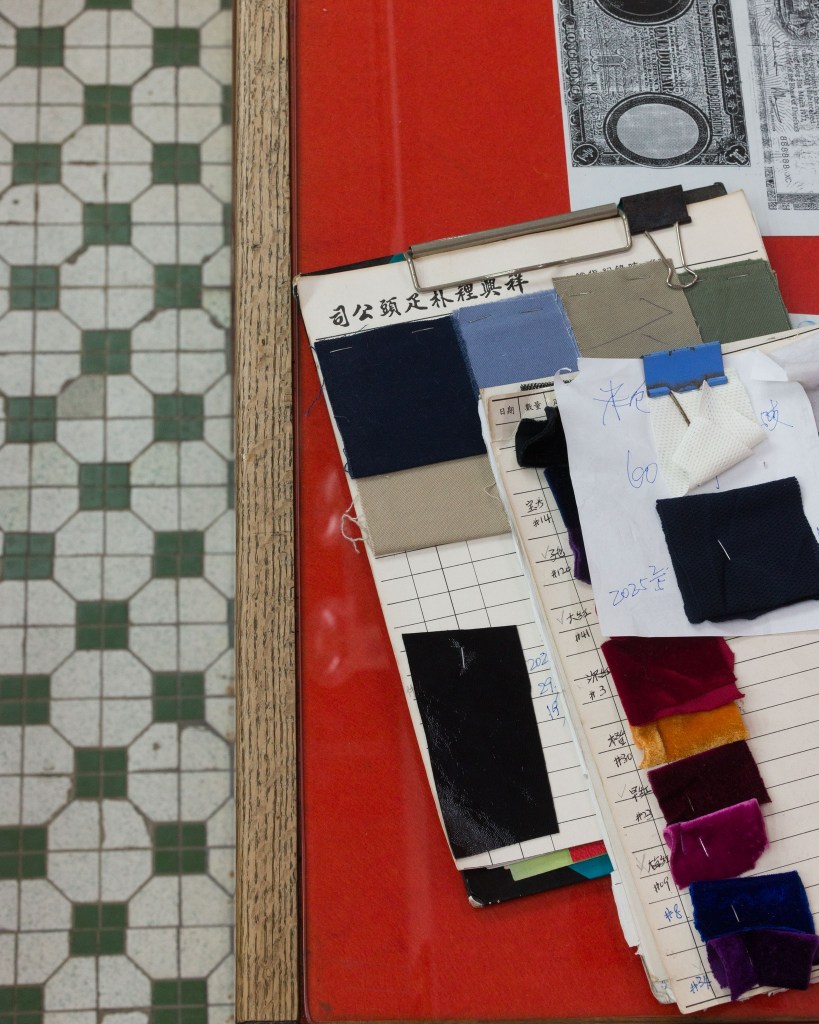 色卡的硬質底板上貼滿了各種顏色和質地的小塊布料樣本,供客人仔細比對挑選。每一張色卡的頂端,都呼應著店舖的主題色,並清晰印上店名「祥興裡朴疋頭」,和一枚由「CH」(Cheung Hing之縮寫)構成的圓形Logo。從店名、招牌字體,到橙色主調及Logo圖案,皆由袁冠鵬親自構思、一手負責,就連地上擺放的貨箱,也無一例外地漆上了祥興標誌性的橙色,細微之處盡顯用心。
