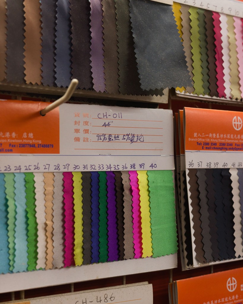 在眾多布料中,論及顏色時,最受歡迎的始終是經典百搭的黑色與白色,其次則是沉穩的寶藍和灰色。當然,祥興亦備有一些帶花紋的布料(如格子、條紋、印花)供顧客挑選。在祥興,布料都是以「碼」為單位計價,整匹出售。一碼的價格根據不同質地,從十幾港元到幾十港元不等,豐儉由人。譬如聚酯裡布(Polyester,可簡讀為「po1 lei2」)雖然相對「焗身」、出汗時會感到「黐立立」,但因其耐用性和相對親民的價格而廣受歡迎;而追求極致舒適與透氣性的客人,則更青睞人造絲(Rayon),或是以卓越品質和親膚聞名遐邇的銅氨絲(Bemberg,較常讀為「bem1 baa2」)。