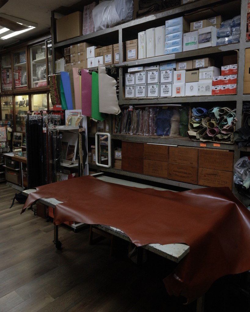 儘管宇宙皮號不再主營皮革銷售,店內仍保留昔日的庫存,例如常用於製作手袋和背包,質地柔軟細膩的西班牙羚羊皮;也有主要用於製作傢俬的大尺寸皮料,例如意大利牛皮(Full Cow)面積可達50至60平方呎,巴西牛皮半張皮(Half Cow)也有20至25平方呎;要讓客人完整細看這些巨幅皮革,就需要動用店中央那張像抽屜那樣拖出來的大型金屬工作檯。
