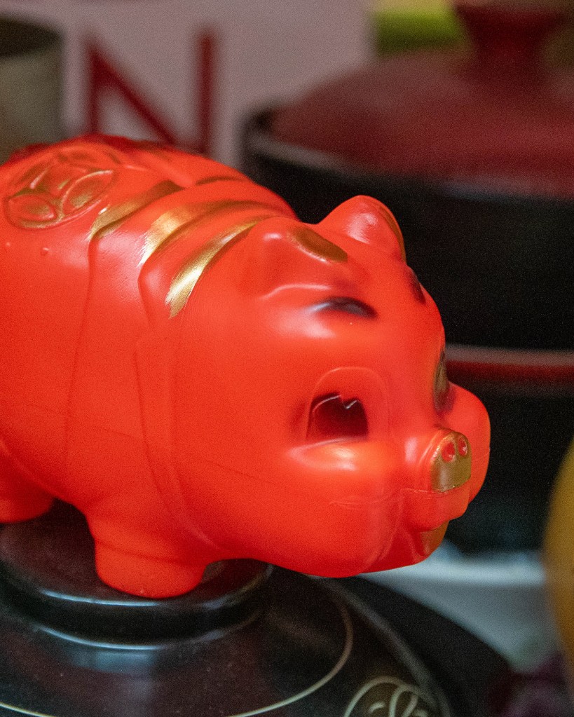 朱榮記眾多貨品中,最為人所共知的莫過於「紅膠豬」。這款膠豬錢罌誕生於七十年代,由黃氏兄弟的廠房製作,其時塑膠產品已經普及大眾市場,因不怕碰撞,家長放心買給小孩把玩及用來儲蓄零錢。醒目的橙紅色豬仔,身上有銅錢浮雕,髹上金漆花紋和黑眼睛,形象討喜;要取出零錢也用不著摔得粉碎,只需切開豬肚即可,著實是七、八十年代小孩的集體回憶。朱耀昌看準原廠房結業,加上希望將紅膠豬捧成為「生招牌」,遂購下模具及版權,即使賣完仍可按需求批量生產。