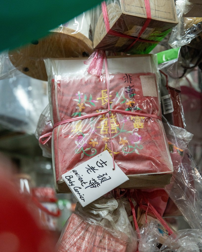 款式尺寸齊全的山貨,也屬於朱榮記特色之一。多種被掛起來以竹或藤編織成的器物,原材料均取自山上,所以都屬「山貨」一類。煮食用的竹蒸架、筲箕、籐編購物籃、藤條及葵扇等,全是主打實用而毫不花俏的器具,反映著原始的民間智慧。店內部分物件貼有「非賣品」,屬只供觀賞的珍貴藏品,都是朱老闆特地保留,早已停產或具舊時代感的用品,例如「古老孭帶」、「古老竹筲箕」和「手織藤書籃」等。