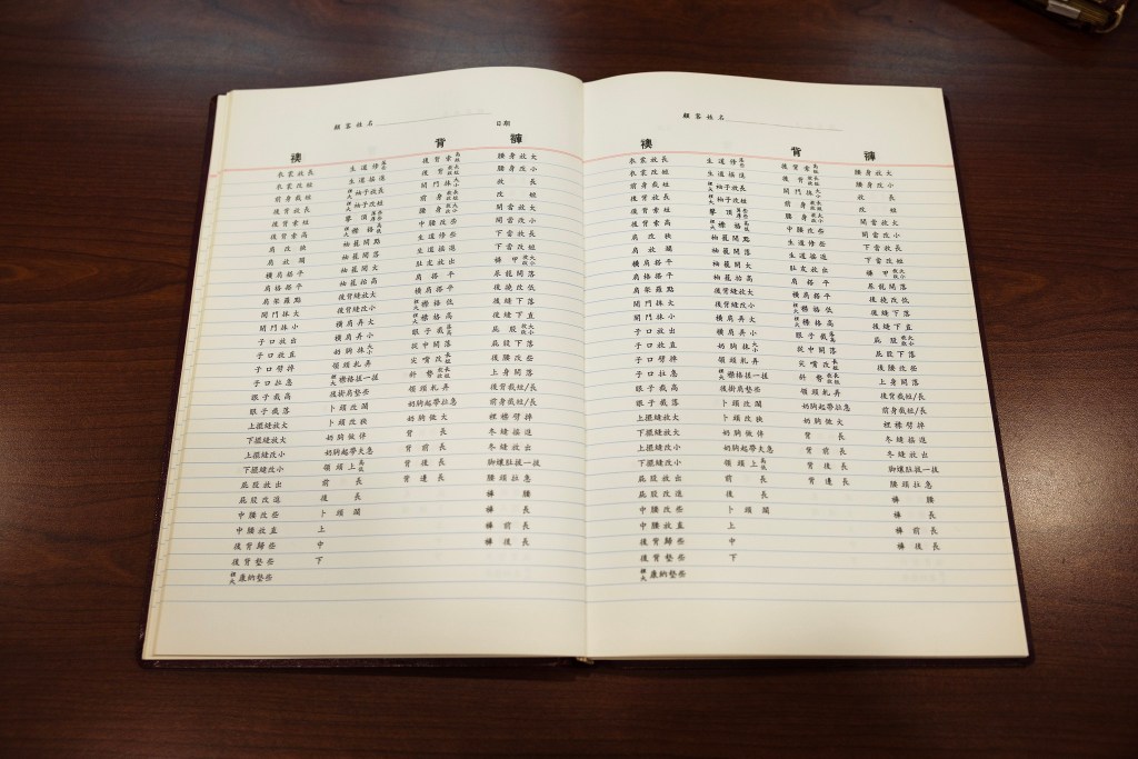 紅幫手工非常講究,著重裁剪、手工、車工、燙工,要求西裝挻正平順。由零開始,直至完成縫製一套西裝,中間包含至少超過100個工序。此外,就在顧客初次試身之後,店員憑其專業判斷如何精修。由於工場師傅大多來自上海,為了清晰準確表達如何修改,所以舖內備有一本紅黑硬皮簿,內裏每頁均有近百項滬語修衣指示,例如「生道搖進」、「屁股改進」、「眼子截高」、「肩架羅點」、「尿龍開落」、「領頭軋弄」、「脚孃肚拔一拔」及「奶胸起帶拉急」等等,店員只需圈下適用指示 ,裁縫依據作出準繩修改。