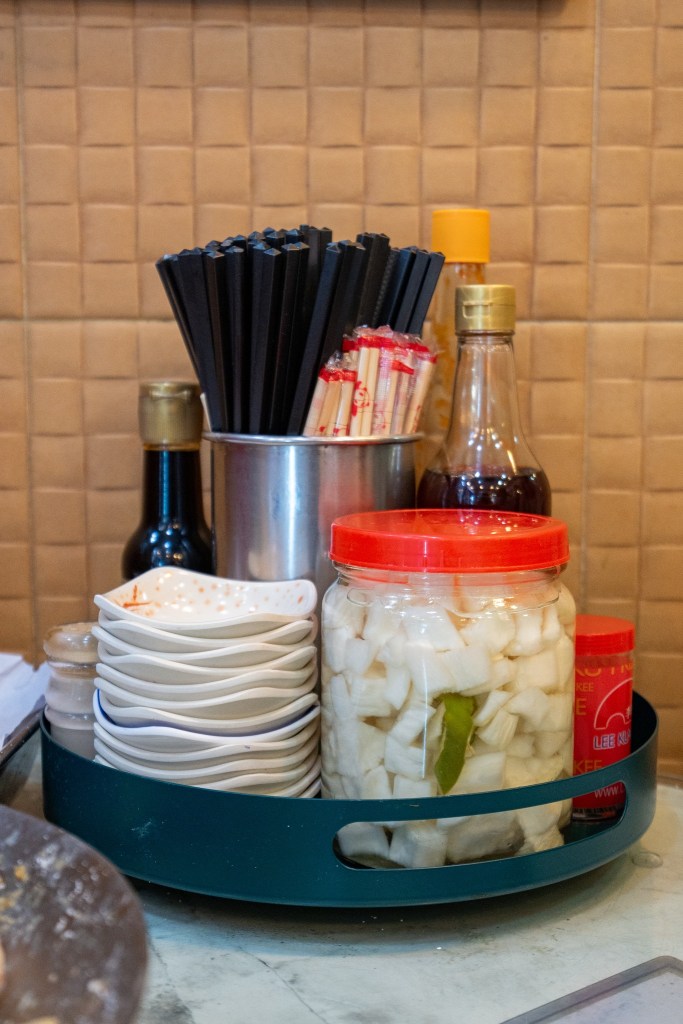 店內每張檯上均有一瓶醃蘿蔔供客人任添任食,這款深受喜愛的小吃都是每天用新鮮蘿蔔加鹽、醋和糖製作,日耗一百斤左右。從前沒有冷氣,夏天天時暑熱,每個食肆都會提供這類開胃小菜。劉森記的醃蘿蔔早在爺爺挑擔的時代就有了,再由劉發昌的父親教授配方傳承,所以他們稱之為「阿爺的味道」,現在一年到晚都可以品嘗,加到湯裡泡熱了都很美味。